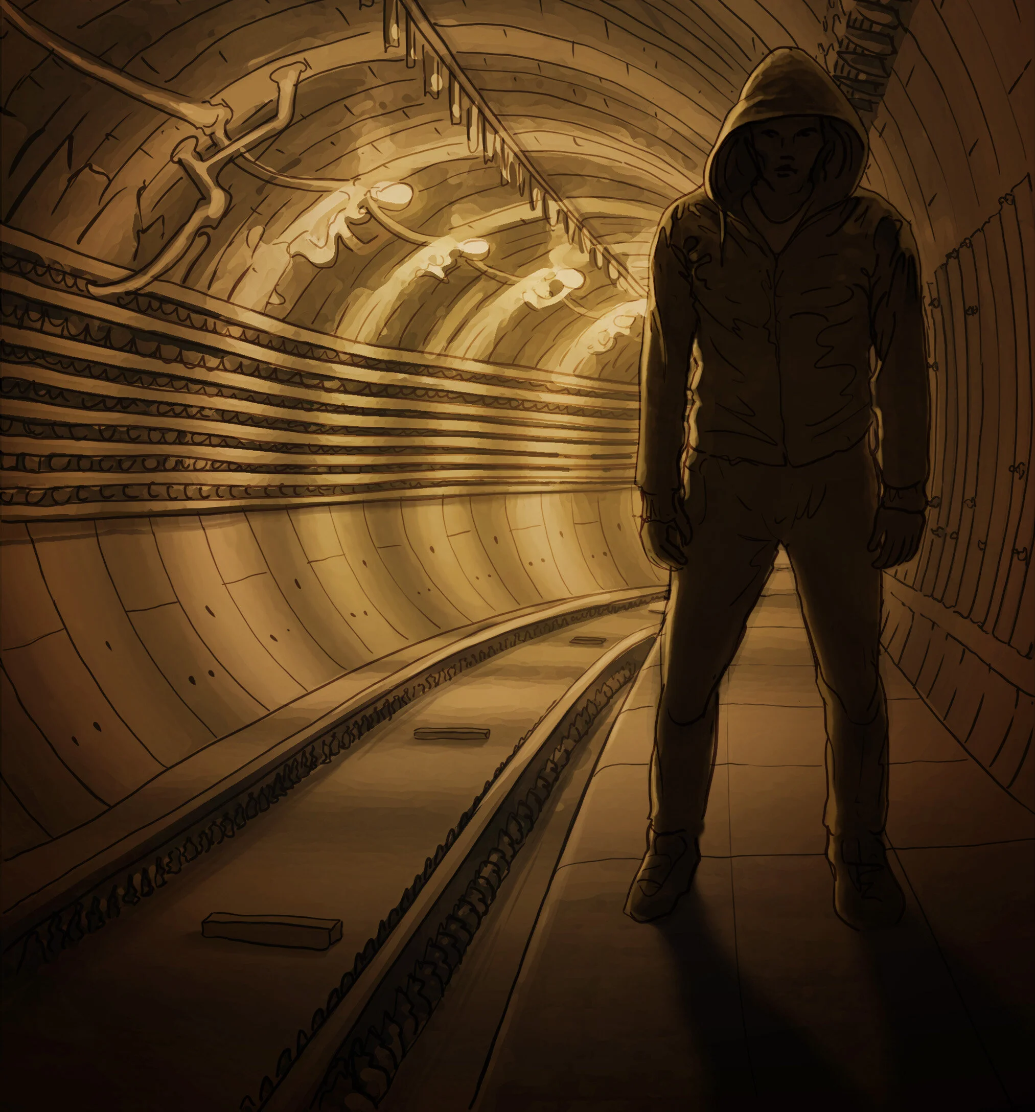 We finally halted before another metal door which he reached out from under my leg to open. We passed through it onto a narrow ledge that hugged the wall of a very large, curving corridor with a set of tracks running down its center: a commuter train tunnel. Two dim, caged yellow bulbs at either end of the visible passage provided the only light. He turned to shut the door behind us, then murmured, “Not long now,” as if I were the one breathing hard. For a moment, he stood listening again. Then, to my dismay, he leapt down onto the tracks and started running up the tunnel.