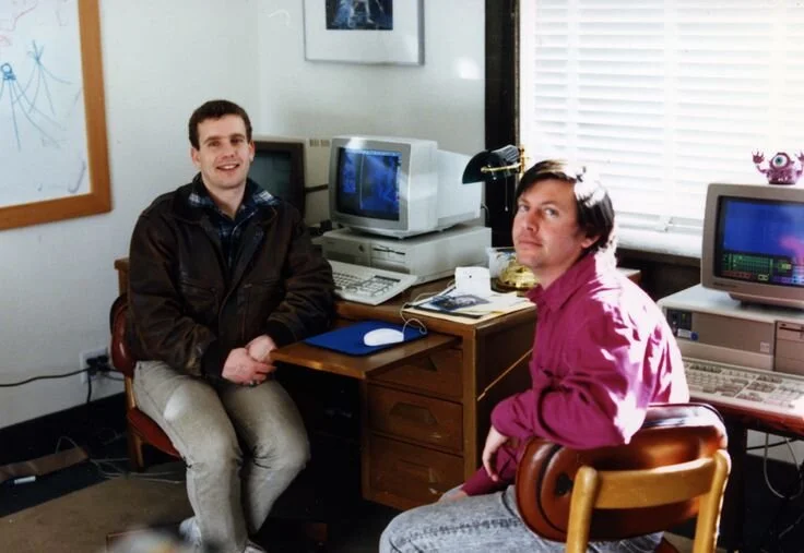 For anyone interested, here’s a photo of myself (on the left) and Gary Winnick, the then-art director of Lucasfilm Games, in the office we shared on Skywalker ranch in Marin, California, where I made EGA pixel art for games like Zak McKracken & the Alien Mind Benders, Loom, and The Secret of Monkey Island— THIRTY SOME YEARS AGO. …sigh. If only I had all that time, energy and potential now, when I know what to do with it… :]